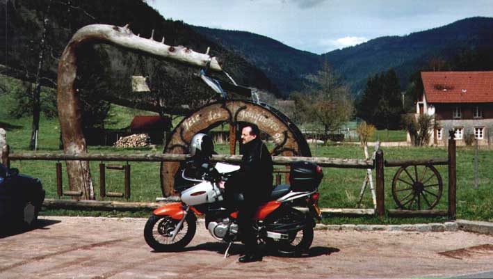 Ainsi donc un deuxième voyage, quinze jours après le premier, (et à peine quelques jours avant ... le troisième !!!!!!!!!!! (mais n'anticipons pas et fermons doublement les charentaises)) était prévu en Forêt Noire, dans le sud ouest de l'Allemagne. L'organisation était due à Moto Pulsion et seul François n'était pas inscrit. Pratiquement 1 an jour pour jour après son achat, la Freewind affichait 16.749 km au compteur. La veille du départ je fis monter un pneu arrière (130/70-17) de marque METZELER Tourance en remplacement du PIRELLI MT80 qui était arrivé à la corde, un peu comme toutes les trajectoires qu'il avait suivies ;-))) L'opération coûta 124,27 €, fournitures, main-d'oeuvre et Tva comprises : et oui, 5000 balles pour un boudin fût-il arrière, ça n'est pas donné, mais ne revenons pas sur les coûts, on sait maintenant que ça fait mal. Bref, comme disait Pépin Le, ainsi parée la Suzette était ... parée pour de nouvelles aventures. Celle-ci commençait au "Space Center " près de Redu où le départ avait TT fixé. Une fois (de plus) n'est pas coutume, c'est moi qui ai rédigé le compte-rendu de ce voyage. Il a été publié sur le site d'Henri, à la rubrique "Bandit --> Voyages 2001" : rendez-vous là-bas et ... retour ici ensuite pour la suite du périple (à vos risques et périples comme qui dirait). Reste que voilà encore une très belle région à découvrir non loin de chez nous : j'ai notamment le souvenir des bonnes odeurs que dégageaient les nombreuses scieries qui ... découpaient le paysage ... arboré. Pour avoir un deuxième éclairage sur cette noire forêt, rendez vous sur le site suivant La Bavière et la Forêt Noire.